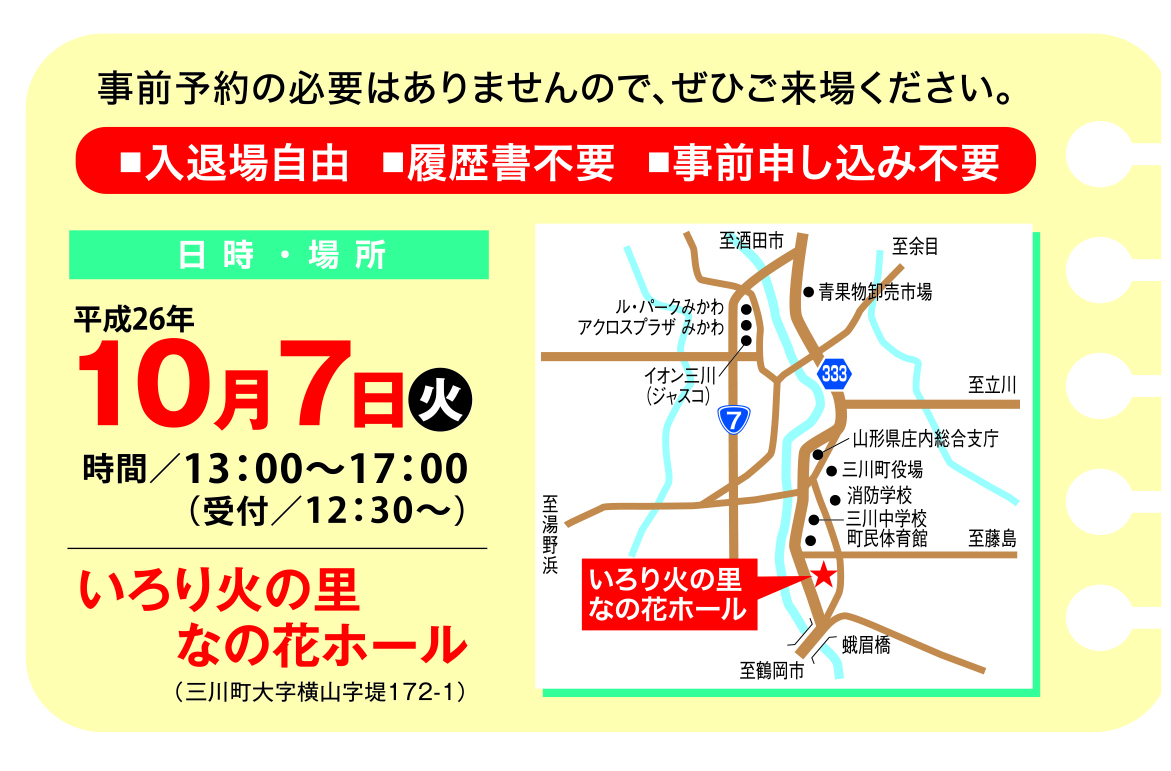 ◆日時/平成26年10月7日(火)午後1時~5時 ◆場所/いろり火の里 菜の花ホール(三川町) ◆主催/山形新聞社