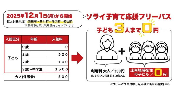 また同日より、子ども利用料の無料化の対象エリアを鶴岡市から庄内全域(鶴岡市、酒田市、三川町、庄内町、遊佐町)へ拡大いたします。